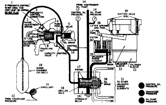 1.自動控制調(diào)節(jié)孔 2.調(diào)節(jié)彈簧 3.氣動控制接頭 4.推桿 5.針閥 6.泄油孔 7.能量調(diào)節(jié)閥 8.移動螺母 9.外部調(diào)節(jié)桿 10.喘振室 11.毛細管 12.來自曲軸箱的壓力 13.控制油壓力 14.來自壓縮機油泵 15.油泵壓力 16.控制油濾器 17.活塞滑閥 18.節(jié)流孔 19.液壓繼動器 20.泄油孔 21.通其他卸載缸 22.缸套 23.卸載套 24.泄油孔 25.卸載油缸 26.活塞 27.驅(qū)動拉缸 28.卸載頂桿彈簧和頂桿 29.吸氣閥片